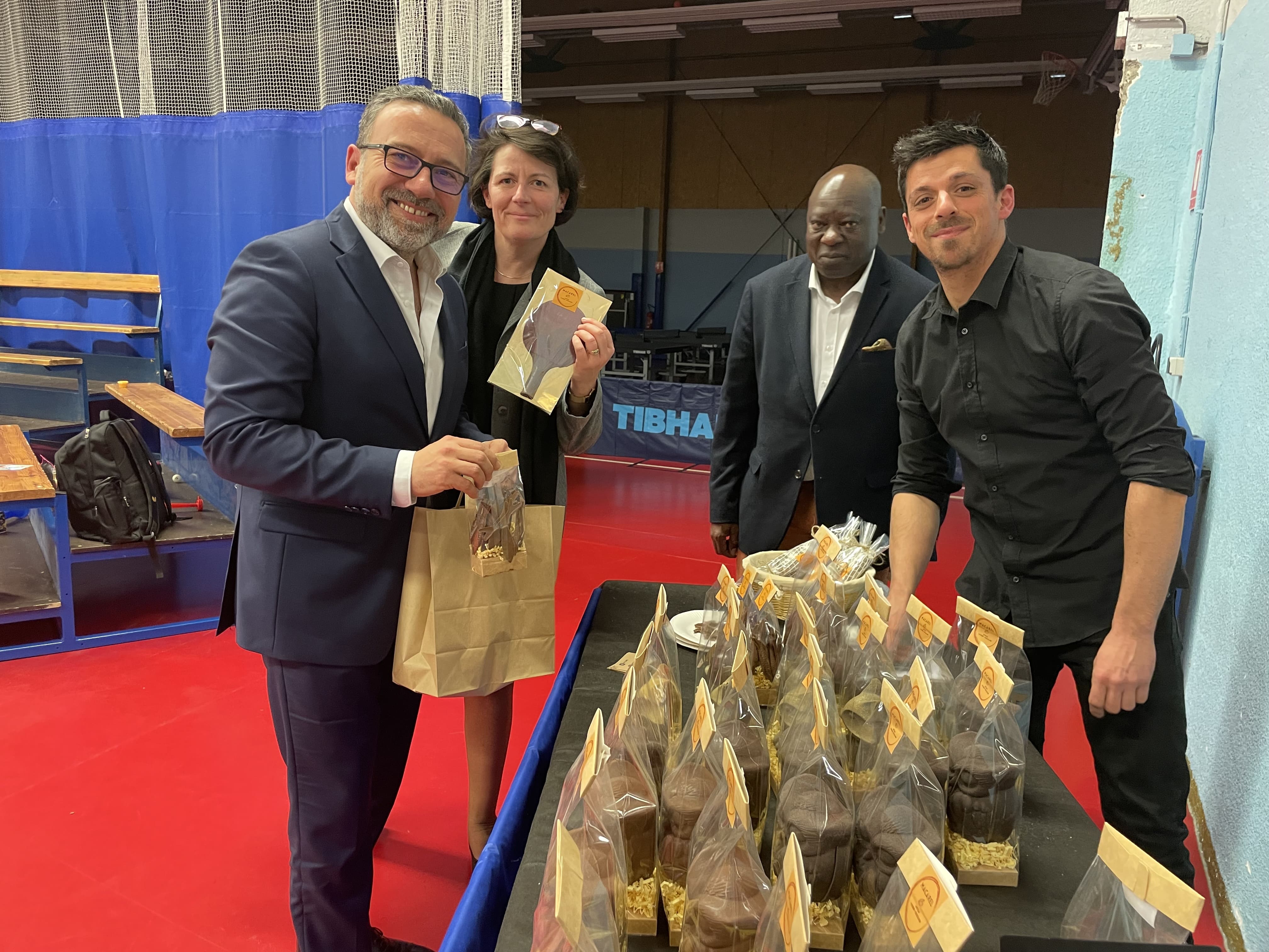 A l’occasion de la réception de Villeneuve sur Lot, le match était parrainé par le Conseil départemental et c’est son Vice Président, Olivier Lebreton, en charge des sports qui a donné le coup d’envoi avant de…déguster les chocolats de notre pongiste – chocolatier Léo Bardy.