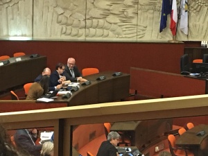 La gouvernance, le financement du sport « Elite ou masse » sur toutes les lèvres dans tous les esprits à une époque où la crise menace et où les aident diminuent!? Faut il être résignés? Bien au contraire faire entendre sa voix pour défendre le sport et ses couleurs…En un mot : mouiller son maillot pas seulement à la table mais lors de réunions multiples en espérant qu’elles soient utiles! Dernièrement et pour la première fois le Vice Président de la Région défendait son rapport avant de passer dans quelques jours à l’étude du budget qui sera certainement difficile. le Président du CROS avait mobilisé ses troupes pour être aux côtés de François BONNEAU et Mohamed MOULAY, montrant ainsi la force du sport en Région. Une cinquantaine de bénévoles de différentes disciplines étaient présents dans l’hémicycle. Bruno SIMON avec ses trois casquettes(4S, Ligue, CROS) était à Orléans..Ici aux côtés de Patrick LOTTE, Directeur des sports de la Région et de Daniel VILLAIN, Directeur Adjoint DRJSCS.