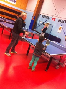 Au club, des exemples ne manquent pas avec nos Vétérans (comme Roger ou Georges). Dernièrement à l’initiative de la ville et de son service des sports, Antoine(le patron du multi activités et des activités « fun ») a encadré une séance découverte pour des seniors. Une douzaine de fidèles à Cité Club s’est retrouvée salle Jean Claude CISSE ou pendant deux heures ils ont pu s’amuser et même échanger des balles avec les minots des T.A.P. Sur cette photo 74 ans séparent nos deux pongistes…Sympa non?!